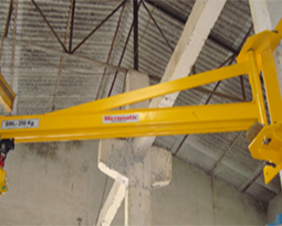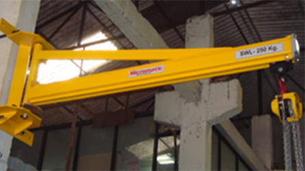 A decisive advantage of wall-mounted slewing jibs is that they require no floor space, since they are mounted on load-bearing concrete walls, pillars or machinery and installations. They are particularly easy to install, since the bracket is ready to be fitted as a unit and eliminates any complicated alignment work. MJR wall-mounted slewing jibs are suitable for the lower load range up to 1000 kg.